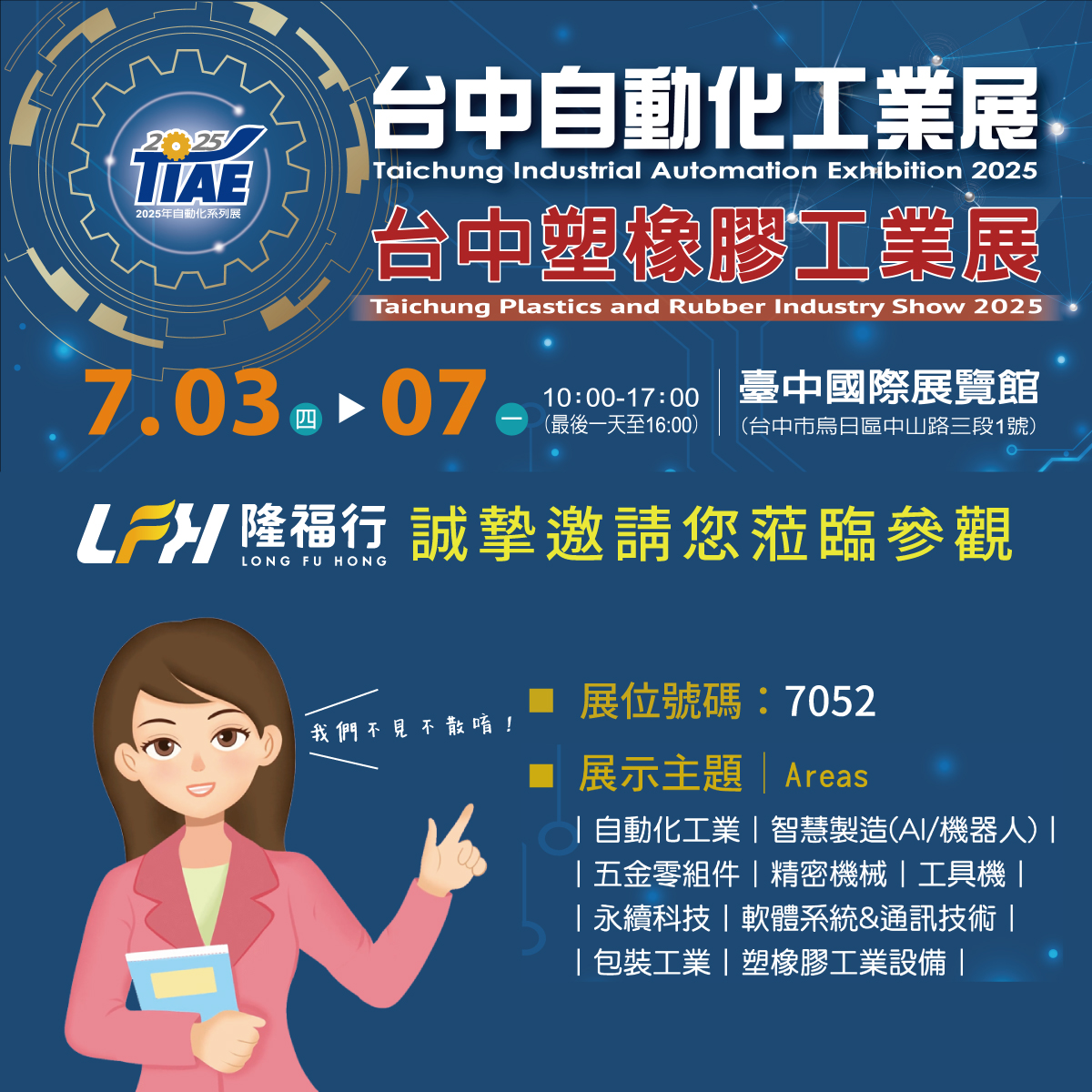 2025台中自動化工業展即將盛大開展! LFH隆福行誠摯邀請您蒞臨參觀指教 展覽日期:7/3(四)-7/7(一) 展覽時間:10:00-17:00(最後一天至16:00) 展覽地點:台中國際展覽館 (台中市烏日區中山路三段1號) 展位號碼:7052